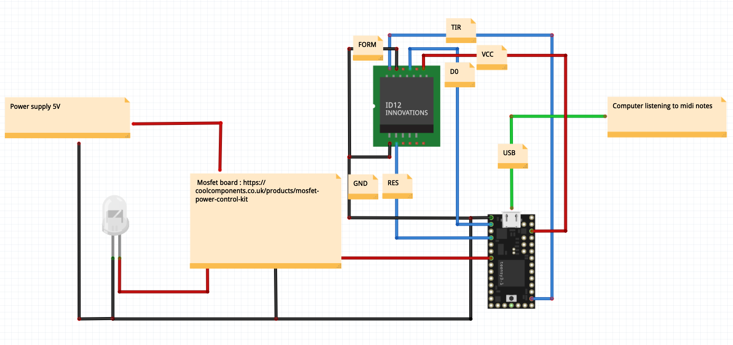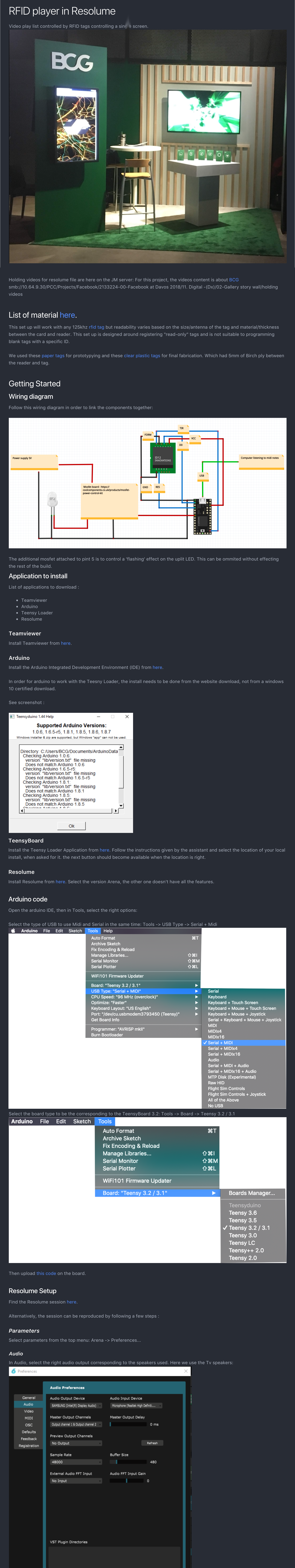 The work involved making a simple electronic circuit with an RFID reader, and linking it to Resolume, for fast replay.