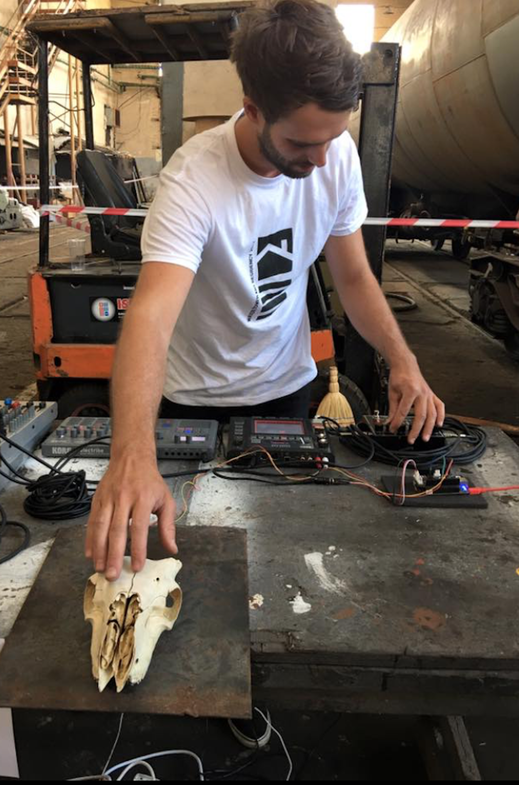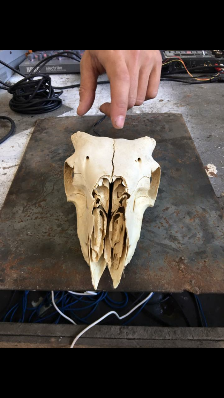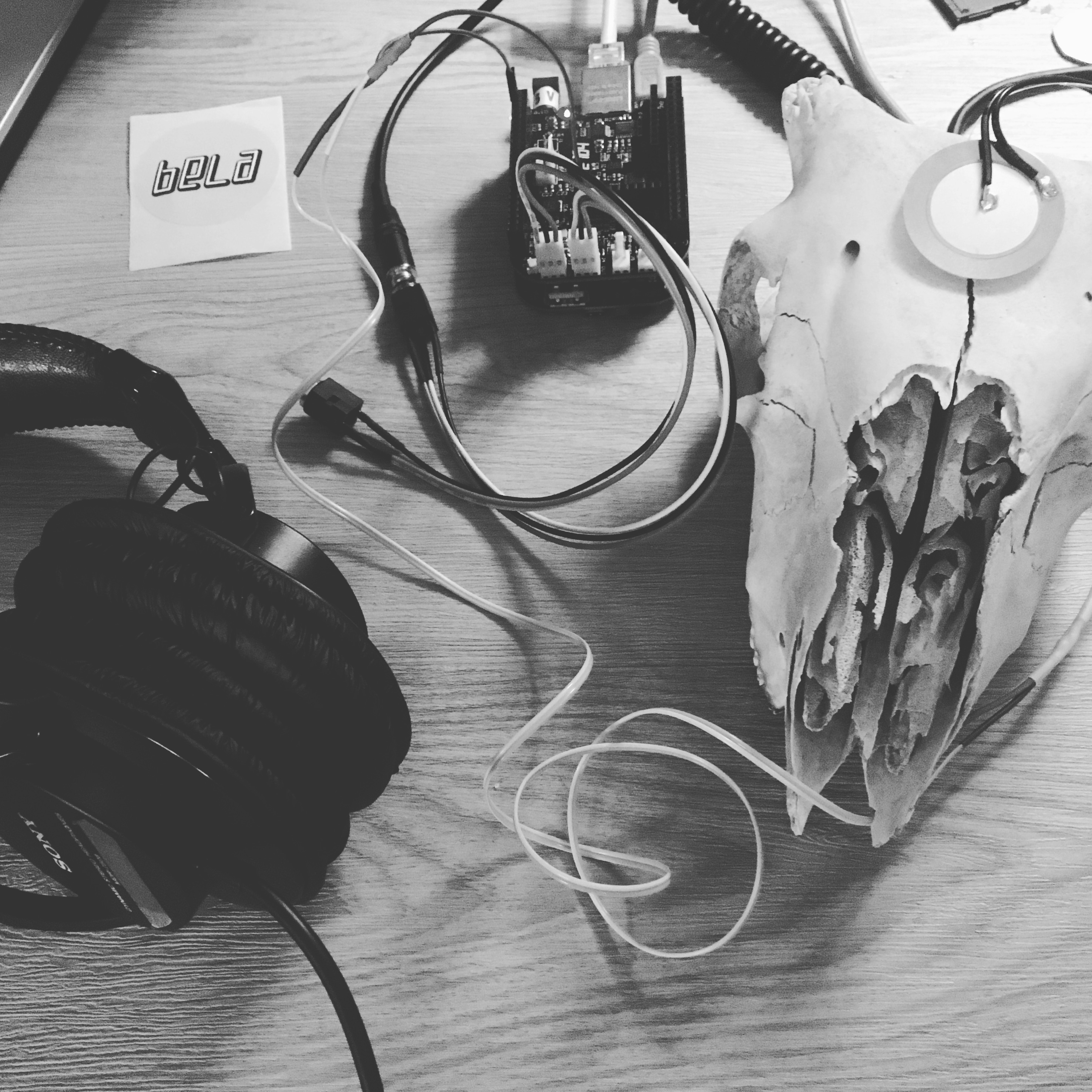Using hardware sound processing electronics - BELA - embedded into a sheep skull, a custom-conceived instrument is created.